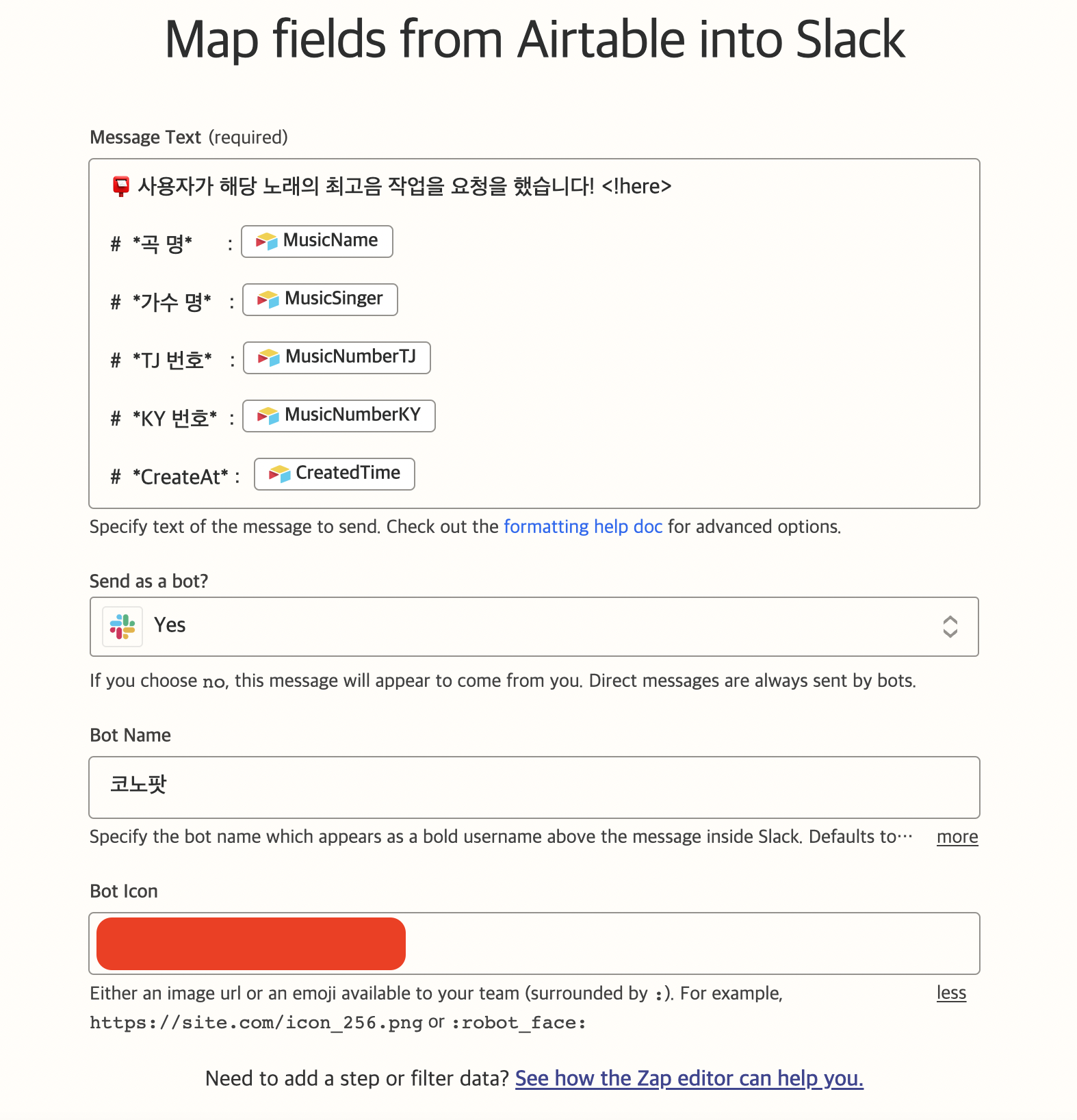 message Text 설정은 다음과 같이 이쁘게 꾸미면 된다. (Air Table의 Row도 알아서 다 나옴)
