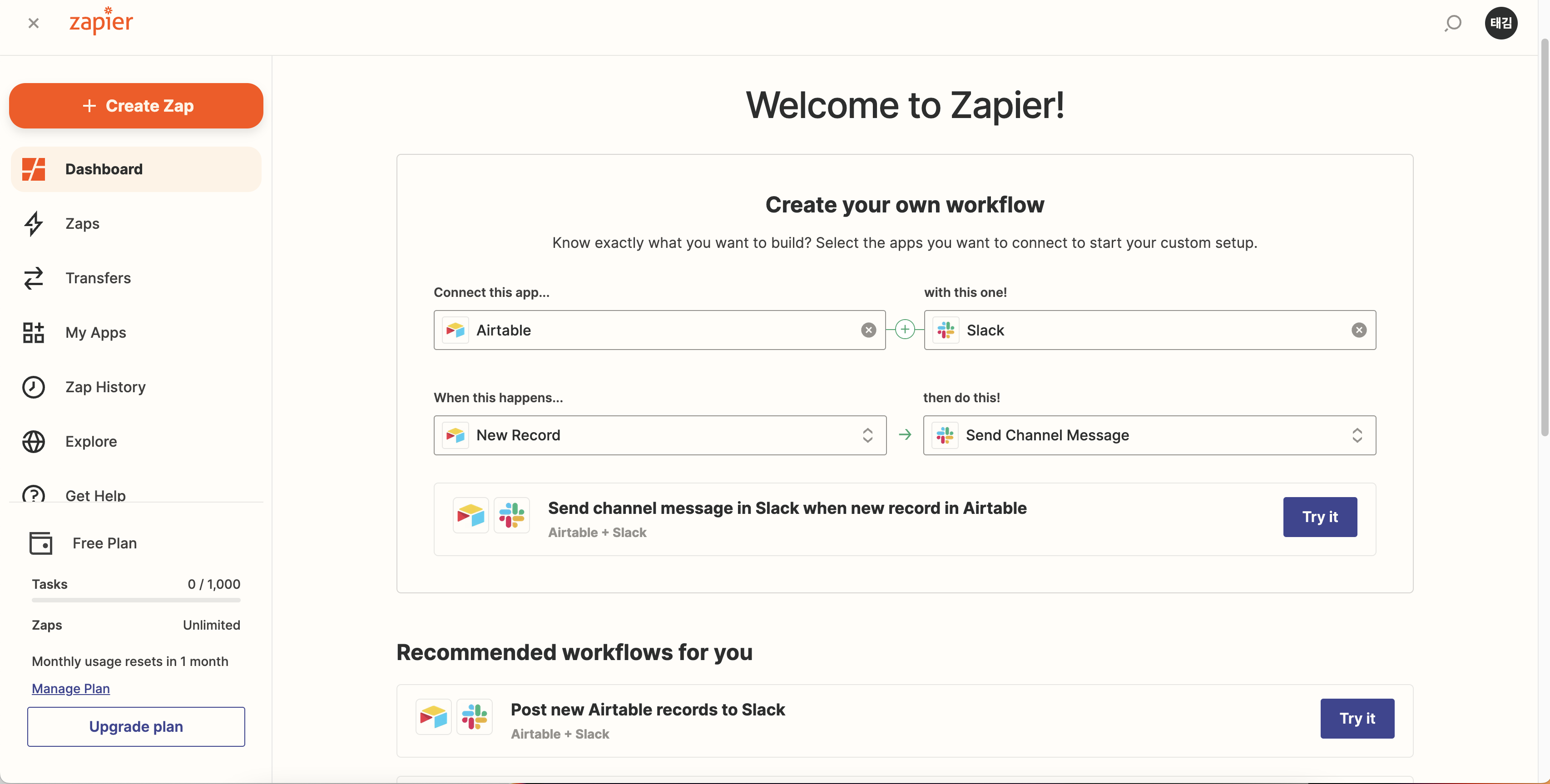 Zapier 역시 무료 플랜이 잘 되어 있다.