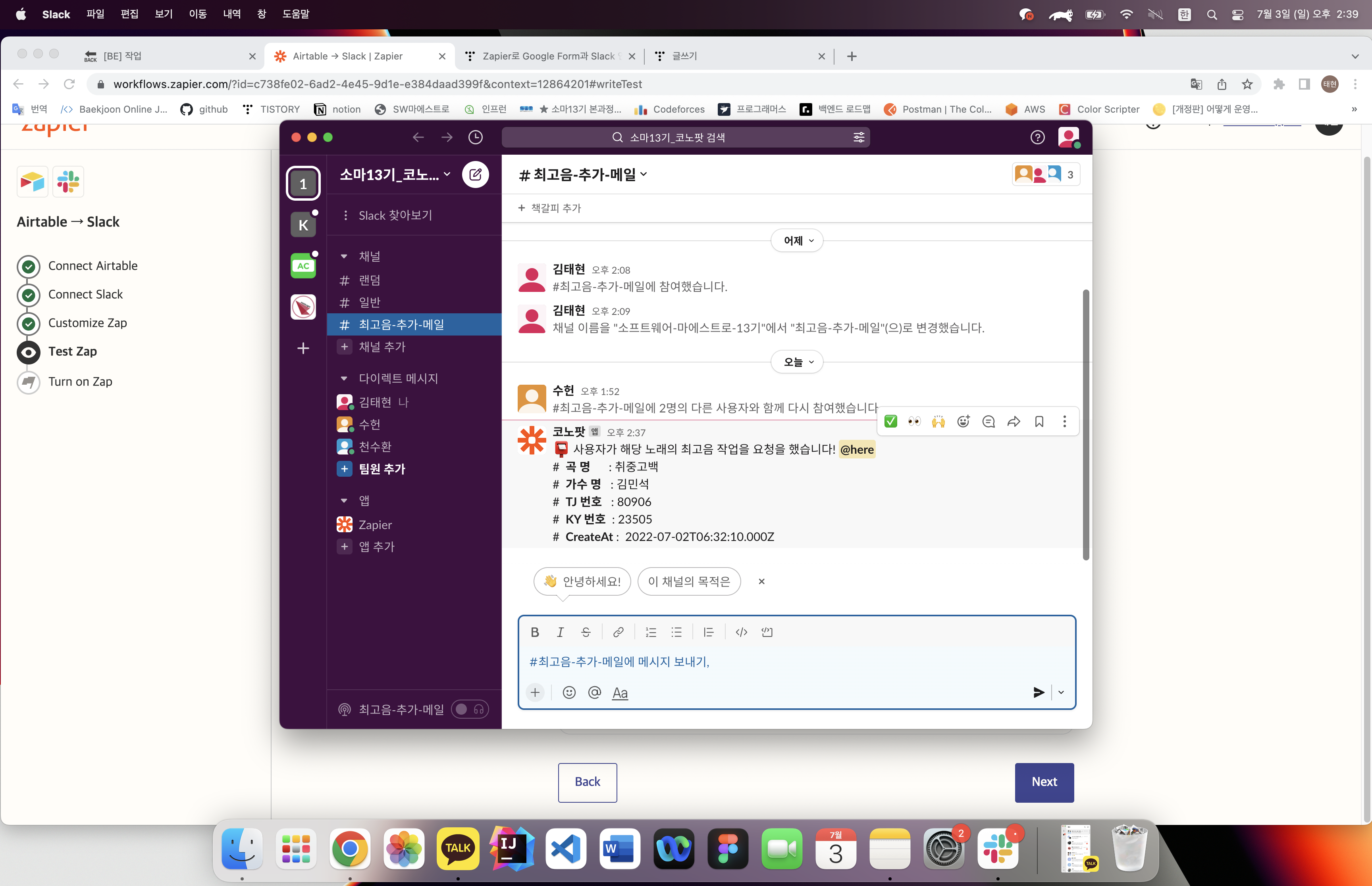 이렇게 Air Table과 Slack을 Zapier를 통해 연동하여 알림 메시지를 받을 수 있게 되었다.