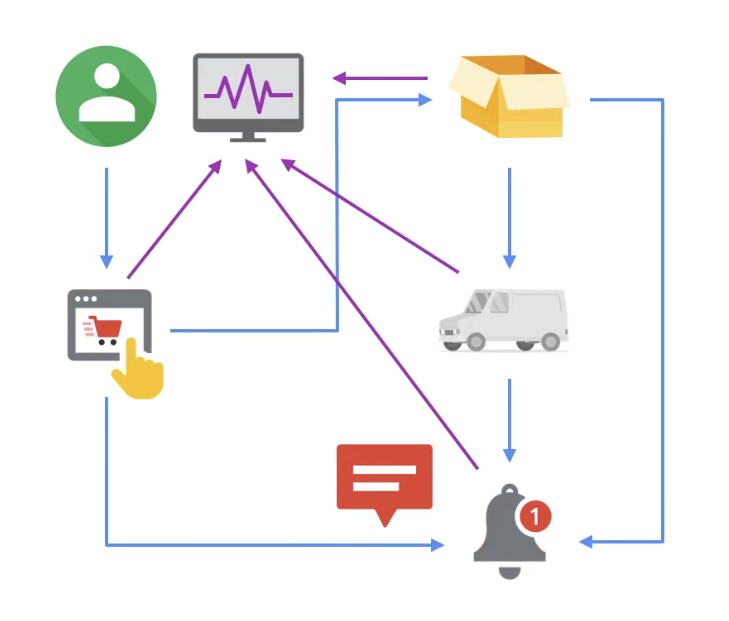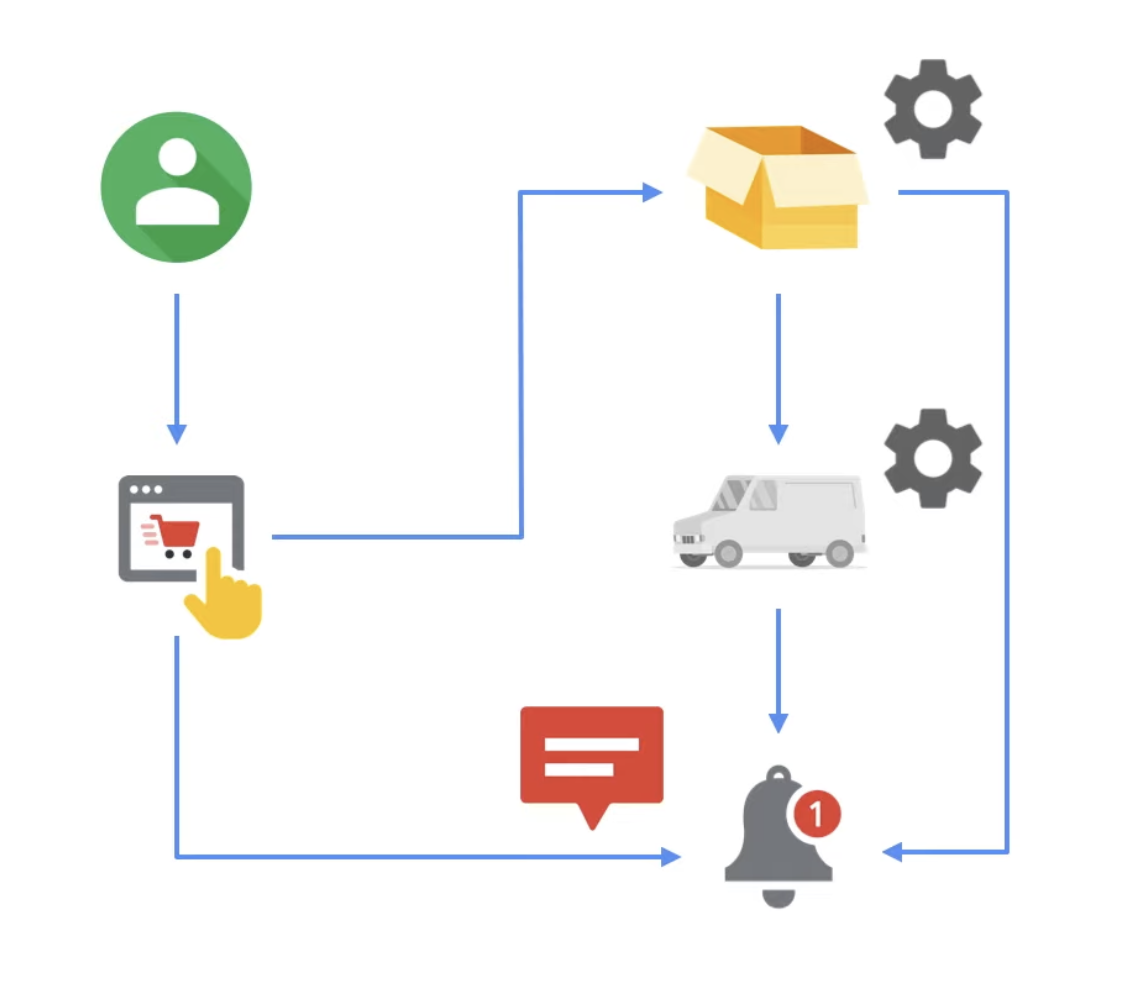 마찬가지로 배송 서비스는 주문 및 알림 서비스가 해당 메시지를 가져오거나 받는 Pub/Sub로 메시지를 보내기 때문에 알림 서비스를 알 필요가 없다.