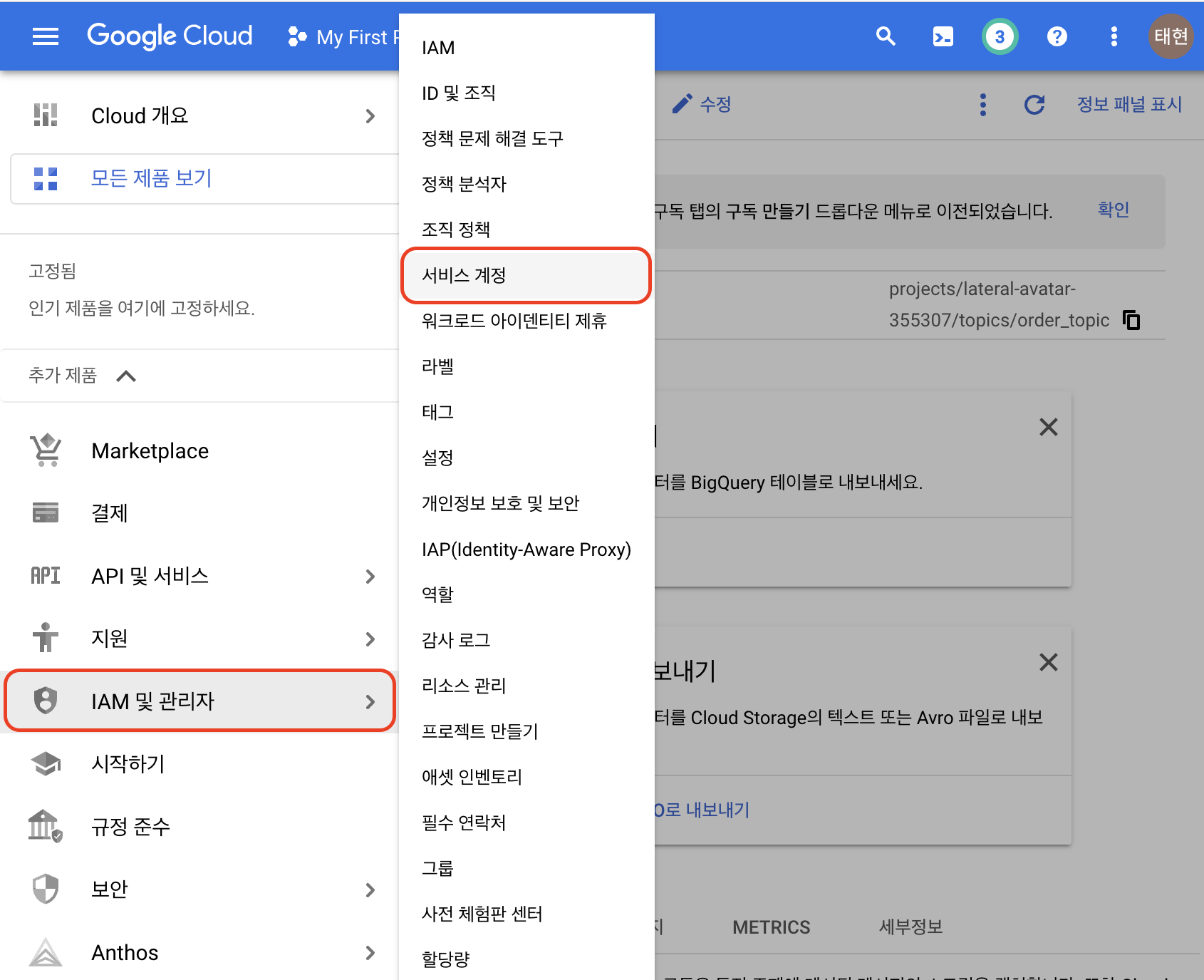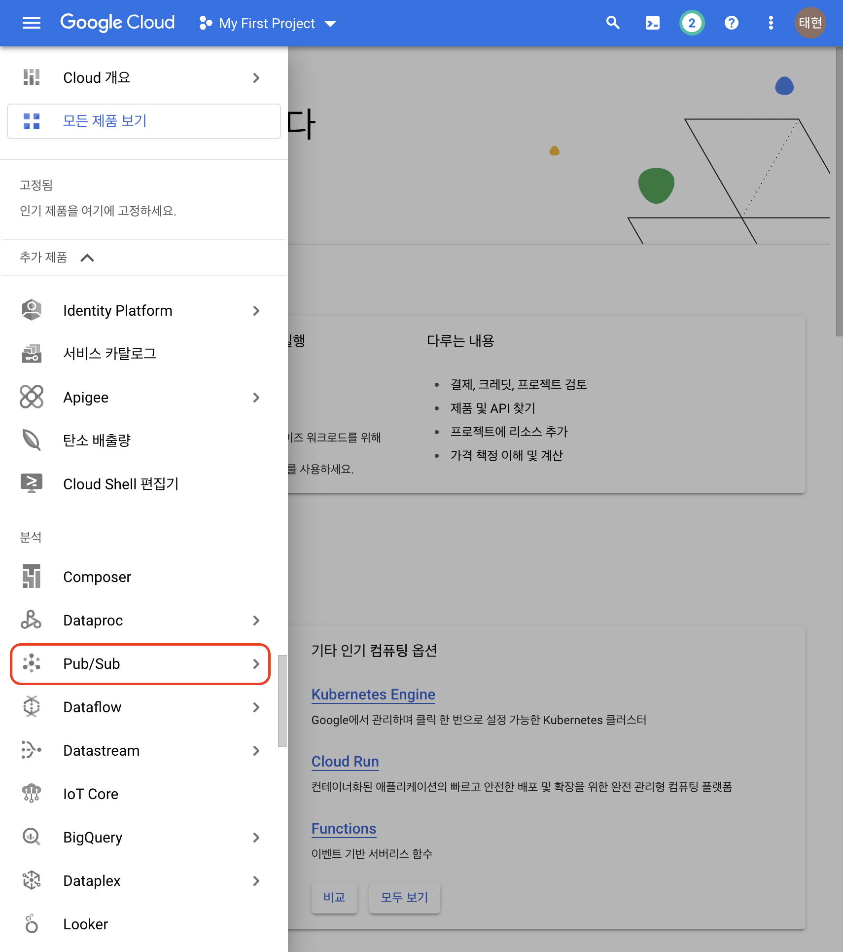 가입이 완료되었다면, 메인 페이지에서 왼쪽 상단의 메뉴 버튼을 누르고 내리다 보면 Pub/Sub 탭을 확인할 수 있습니다.