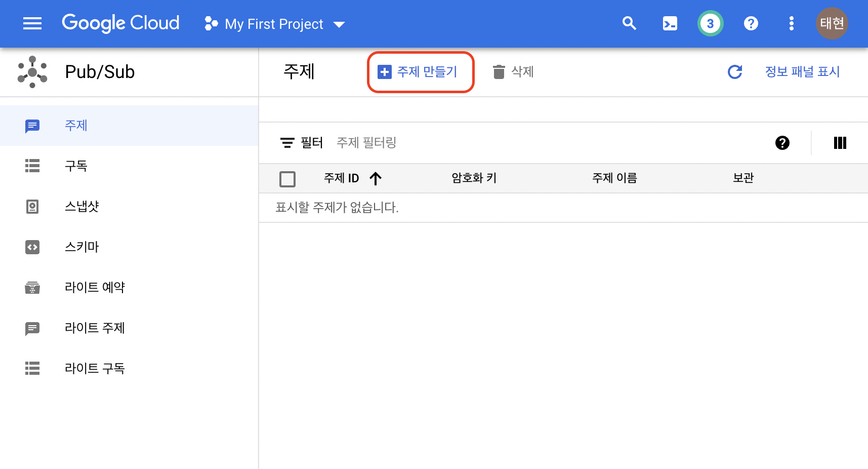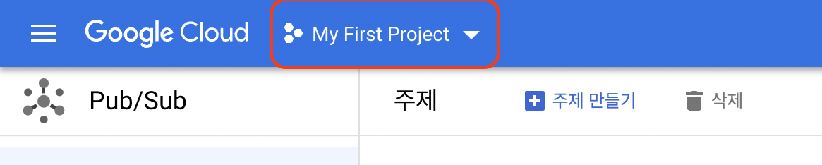 Google Cloud의 PubSub 페이지에 들어가 보면 내 프로젝트가 My first Project로 되어있다.