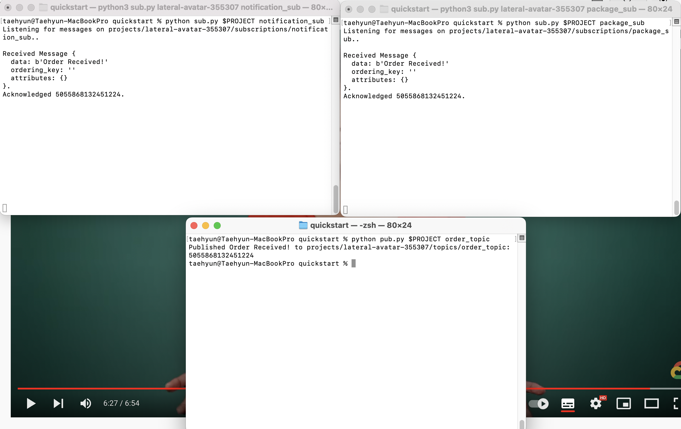 Subscriber 역할을 하는 터미널 창 : python pub.py $PROJECT order_topic