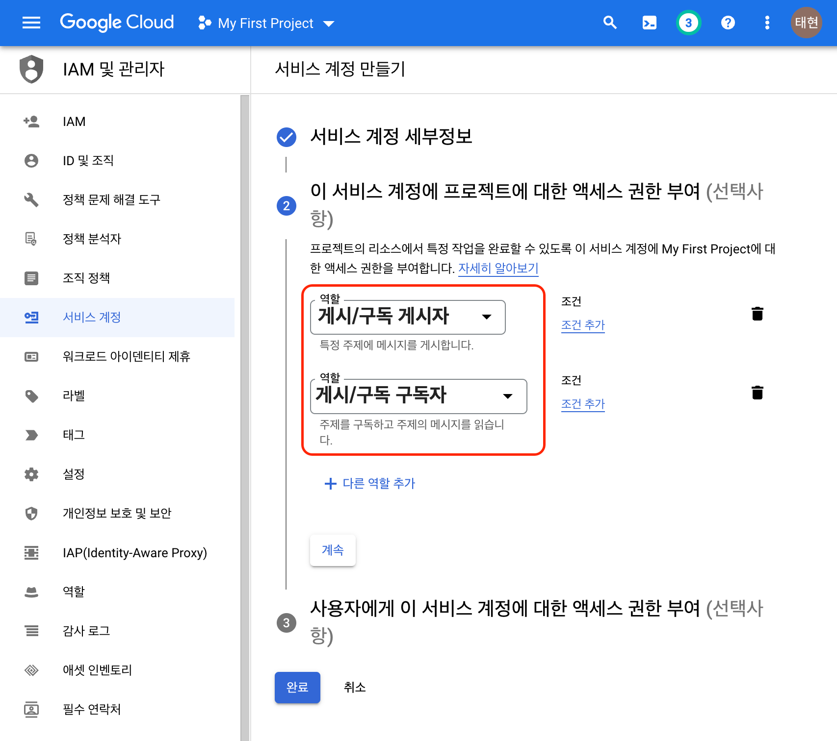 (아래 사진에서 역할을 처음에 잘못설정했었다.. pub/sub 라이트 게시자 하면 나중에 실행 안됨!!)
