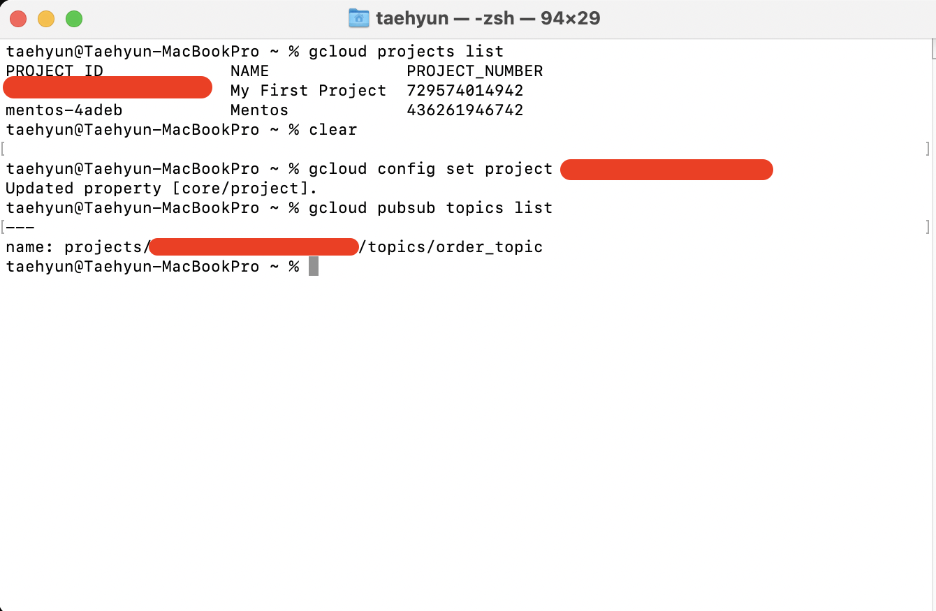 taehyun@Taehyun-MacBookPro ~ % gcloud pubsub topics list