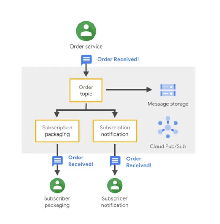 Order가 들어오면 Pub/Sub은 해당 Topic을 구독하고 있는 packaging과 notification Subscriber에게 Order가 들어왔음을 알리는 모델이다.