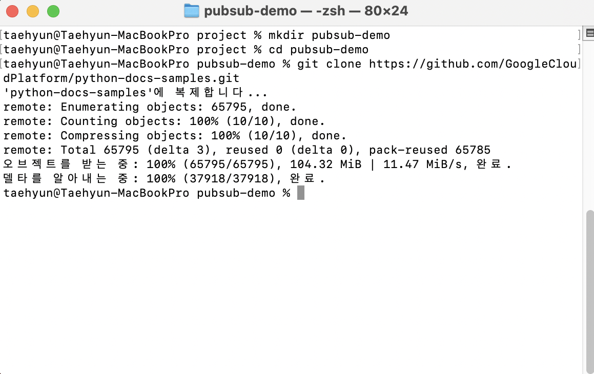 아까 위에서 pubsub-demo 폴더에 클론 한 것 지우고 다시 클론 합니다.