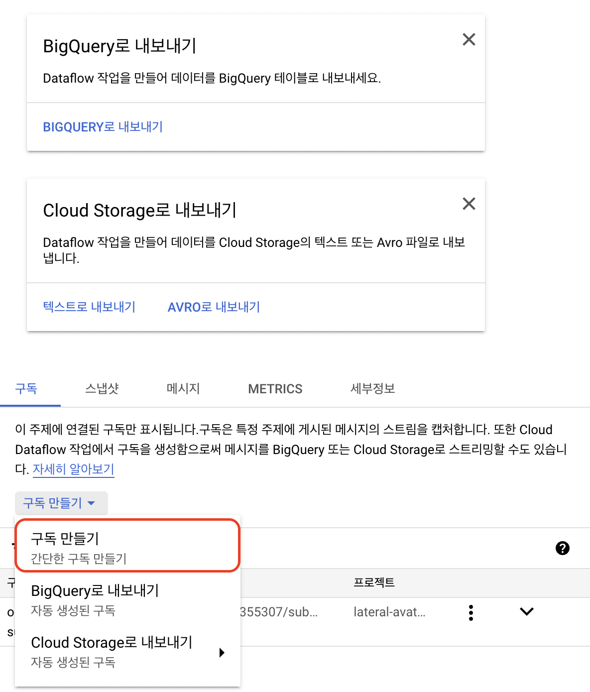 이제 Pub/Sub으로 들어가 보면 여러가지 탭을 확인할 수 있습니다.