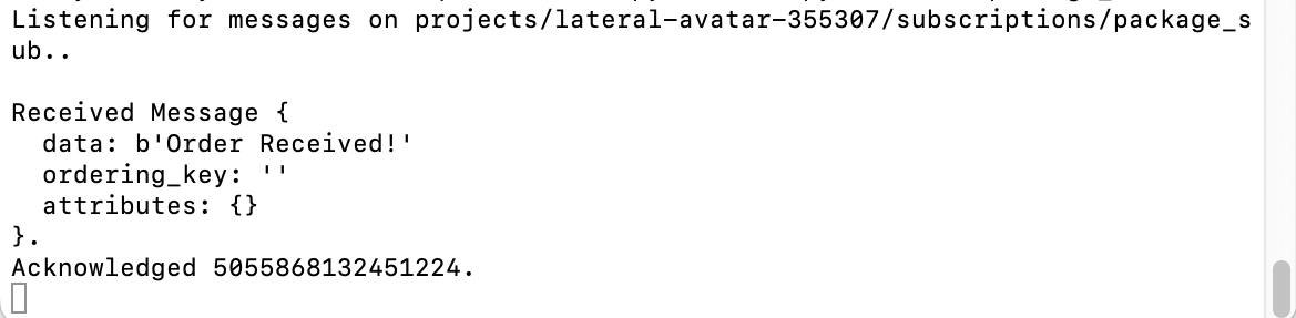 이 화면은 Publisher가 "Order Received"란 메시지를 보낸 것을 Subscriber가 가져온 것이다.