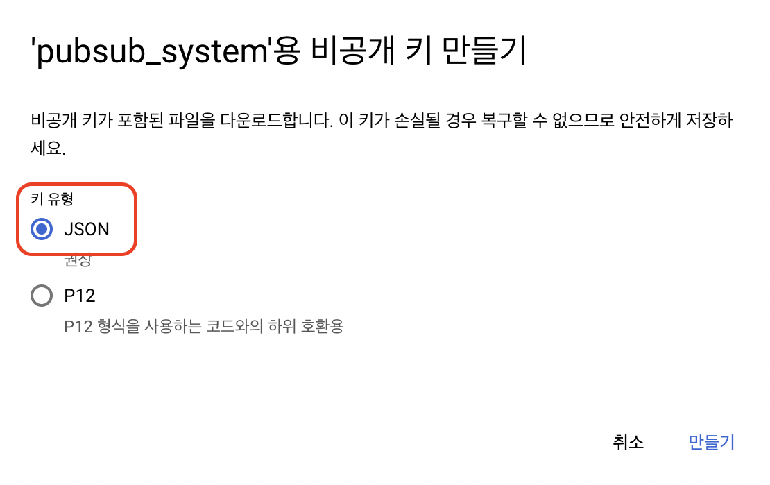 키 생성을 완료하면 Download 폴더에 확인 후 파일 이름을 "key.json"으로 변경한다.