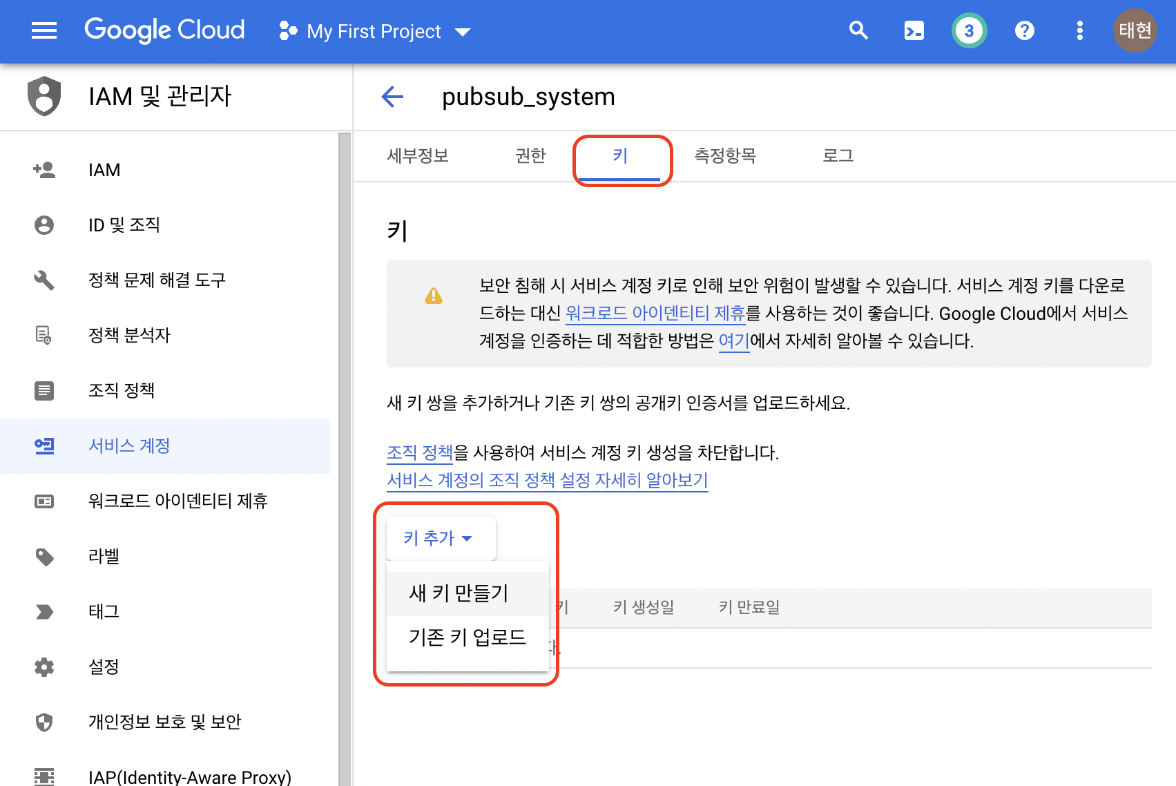 계정 생성이 완료되었다면 키 탭으로 들어가 키를 추가해준다. (Key는 JSON)으로!