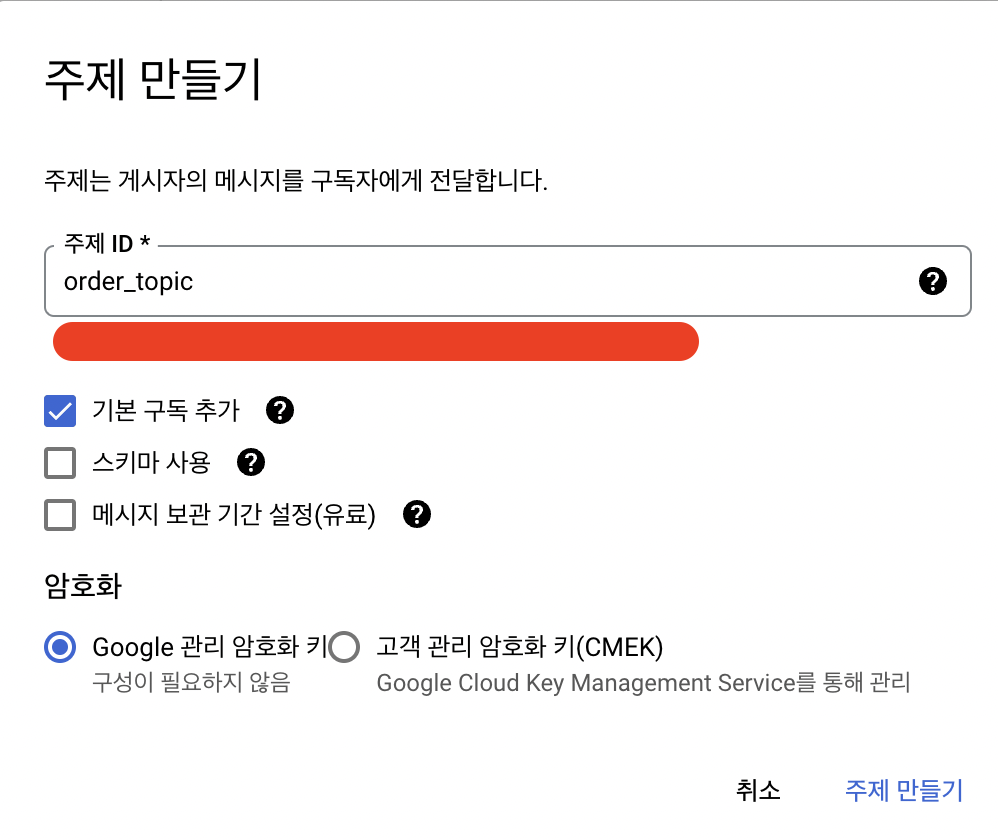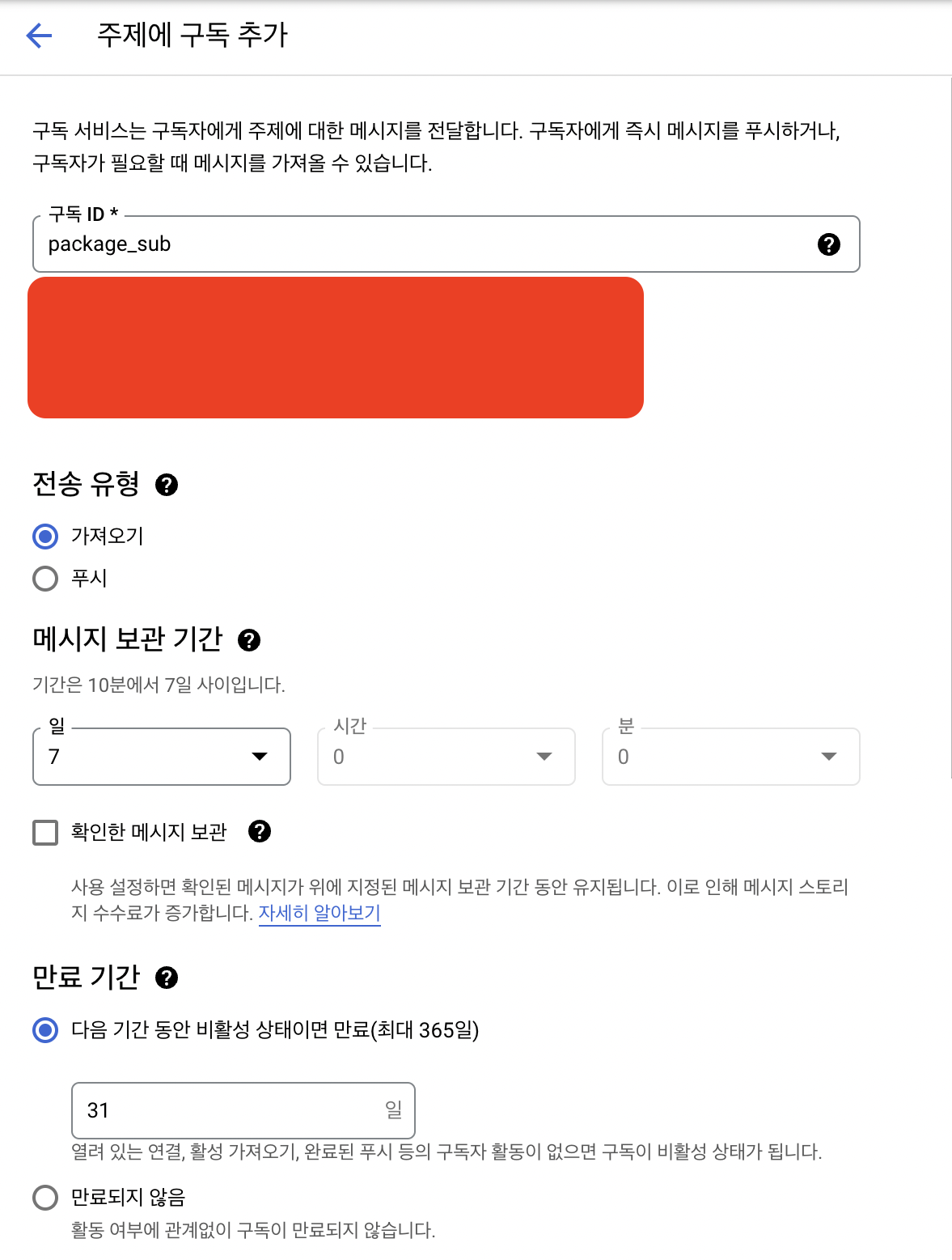 나머지 설정은 default로 설정한다. 즉 가져오기(Pull) Subscription을 생성하는 것이다.