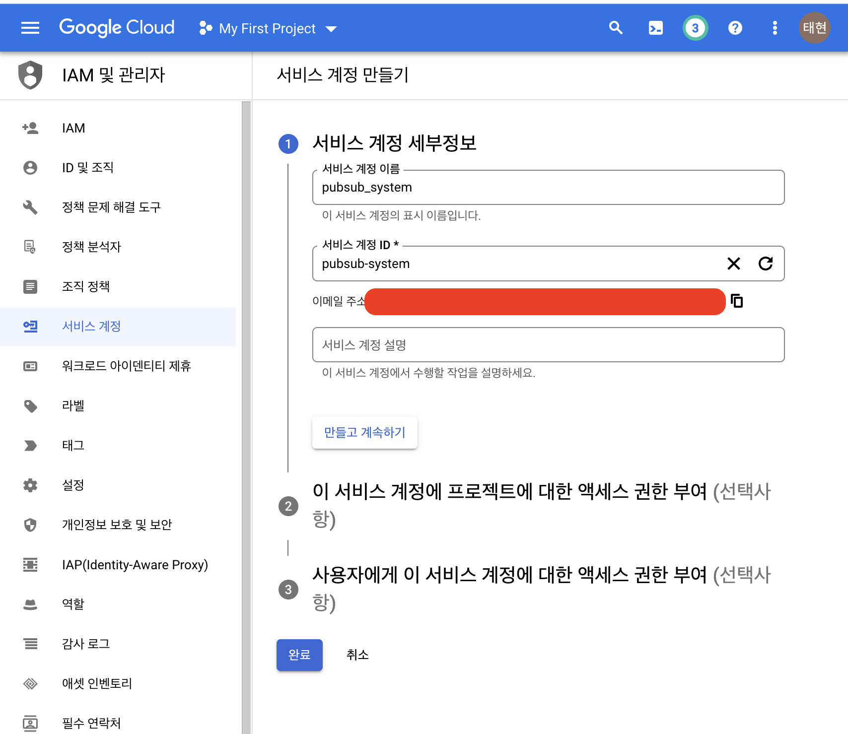 다음으로 상단의 서비스 계정 만들기를 선택하고 아래 사진처럼 진행한다. (액세스 권한 부여 확인하기)