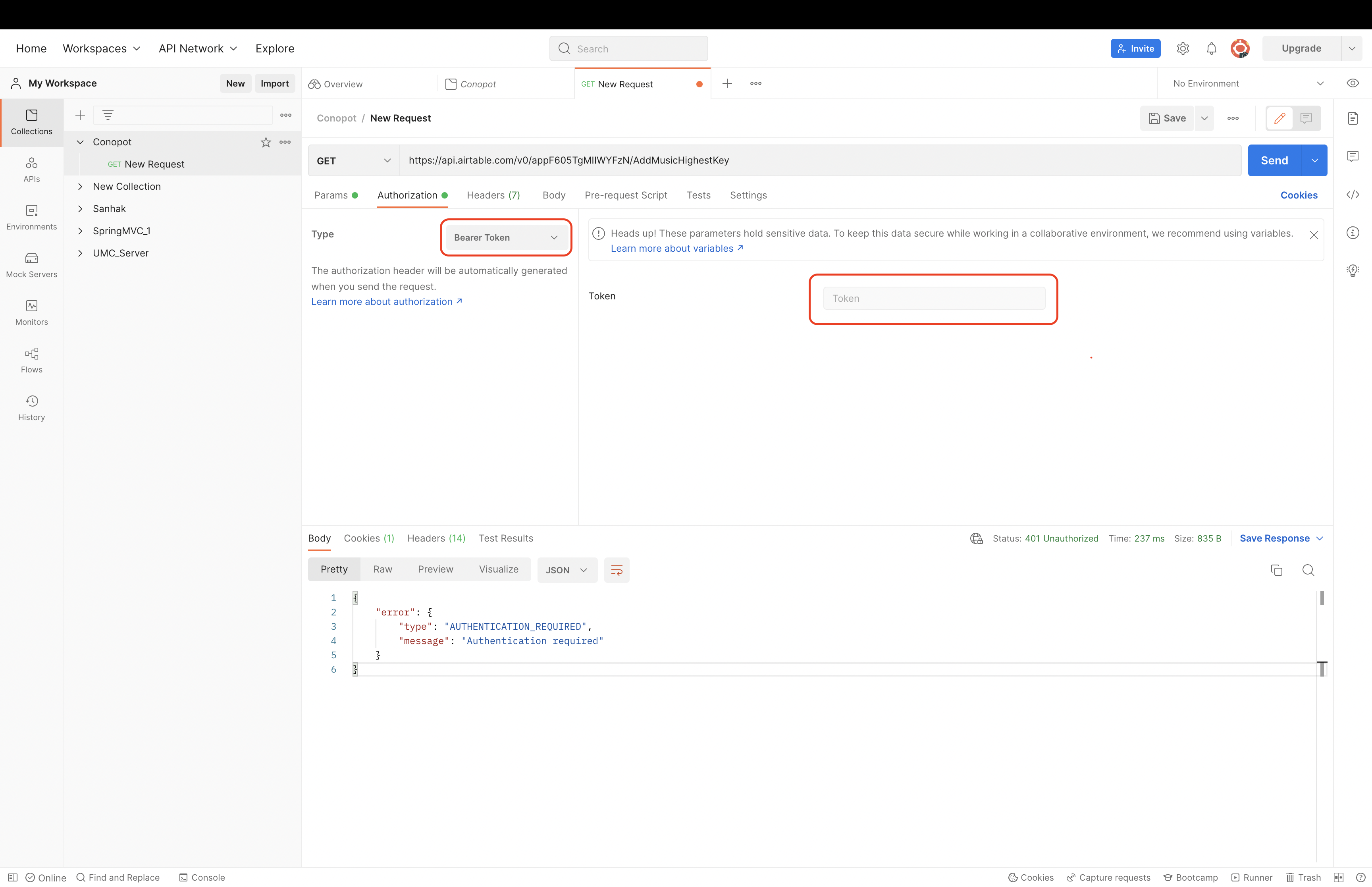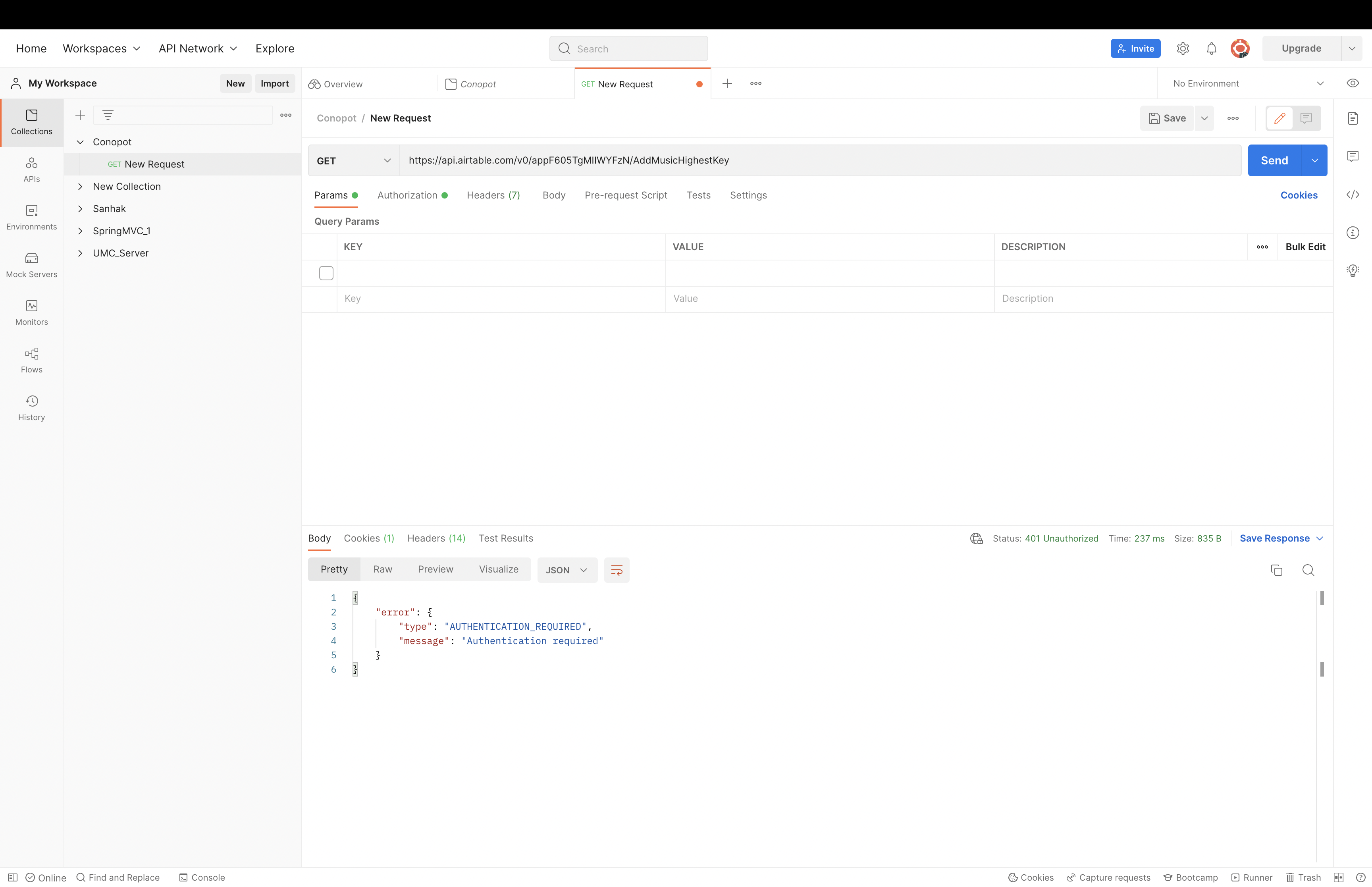 당연히 아까 저장해놓았던 Auth 인증해야지 호출이 된다.