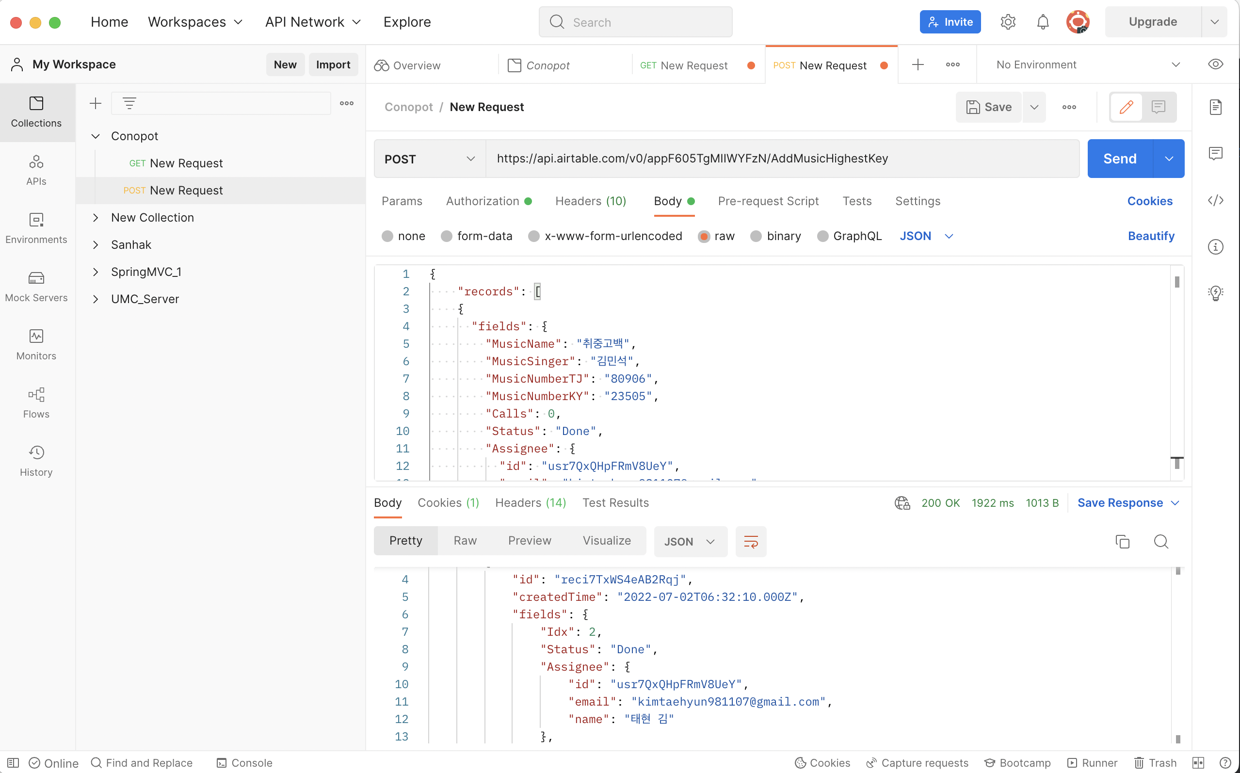 POST롭 보낸 데이터가 Air Table에 잘 들어와 있는 거 확인할 수 있다.