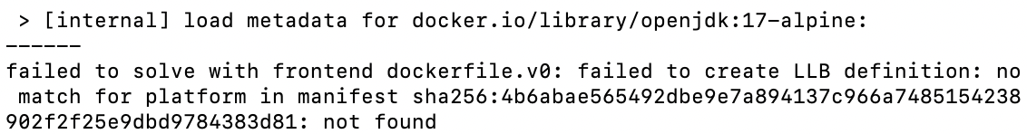 또 자신이 M1 맥북이라면 위의 코드처럼 꼭 platform을 넣어주어야 한다. 안그러면 아래와 같은 오류를 만나게 된다.