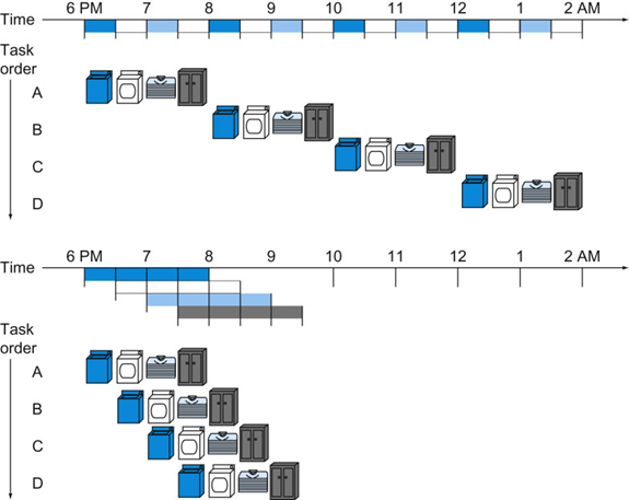단순히 순차적으로 세탁->탈수->건조->옷장->세탁->탈수->건조->옷장.. 과정을 거치면서 세탁을 할 수 있다.