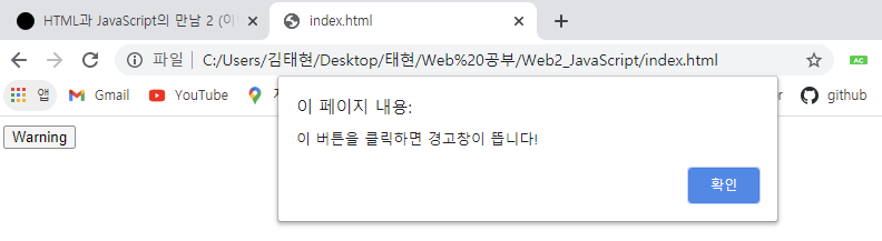 이 때 onclick이란 코드 뒤에는 반드시 JavaScript 코드가 와야 한다. 이 뜻은 "alert()"가 JavaScript 코드란 것이겠죠?