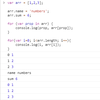 흔히 사용했던 for문으로 출력을 하면 배열의 원소값들이, for in문을 사용하면 모든 프로퍼티들이 출력된다.