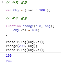 위 사진을 잘 보면 Obj란 객체를 인자로 넘겼기 때문에 Call by Reference, 즉 val값이 100에서 200으로 바뀜을 알 수 있다.