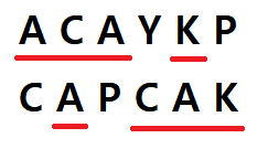 만약 ACAYKP 란 문자열과 CAPCAK 란 두 개의 문자열이 주어졌을 때,