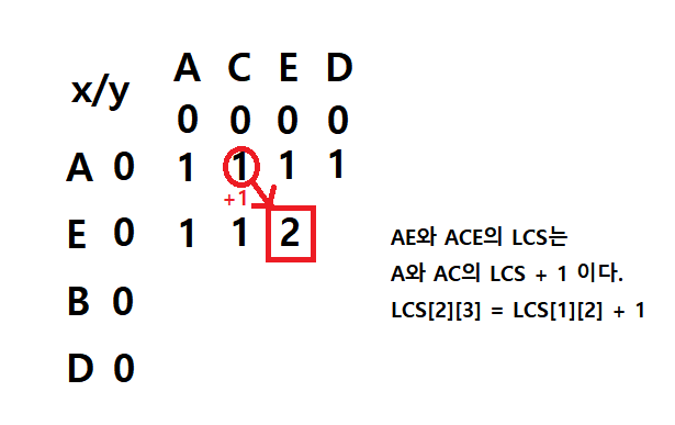 AE란 문자열과 ACE란 문자열의 LCS를 구하고 싶다면, 그 전까지의 문자열 A와 AC, 이 두 문자열의 LCS를 구한 뒤 + 1 하면 된다는 것이다!