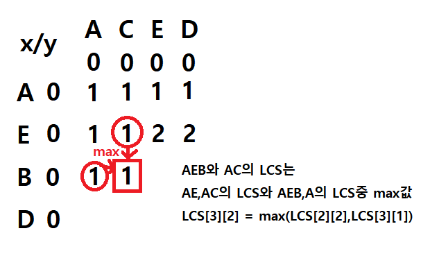 LCS(AEB, AC) = longest(LCS(AEB, A), LCS(AE, AC))이다.