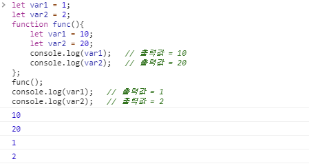 var1과 var2가 전역 객체, 그리고 함수 안에 동시에 선언되었다.