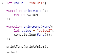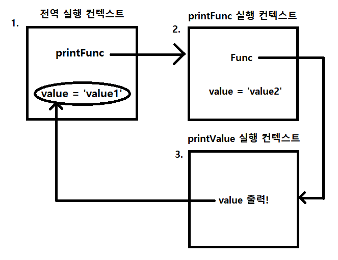 전역 실행 컨텍스트에 value = 'value1' 이란 값을 가지고 있기 때문에 결국 출력은 value1을 출력하게 되는 것이다.