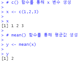 이 '=' 연산자가 R에서는 다른 용도로도 사용되기 때문에 '<-' 연산자를 통해 변수를 생성하는 것이 좋다고 한다.