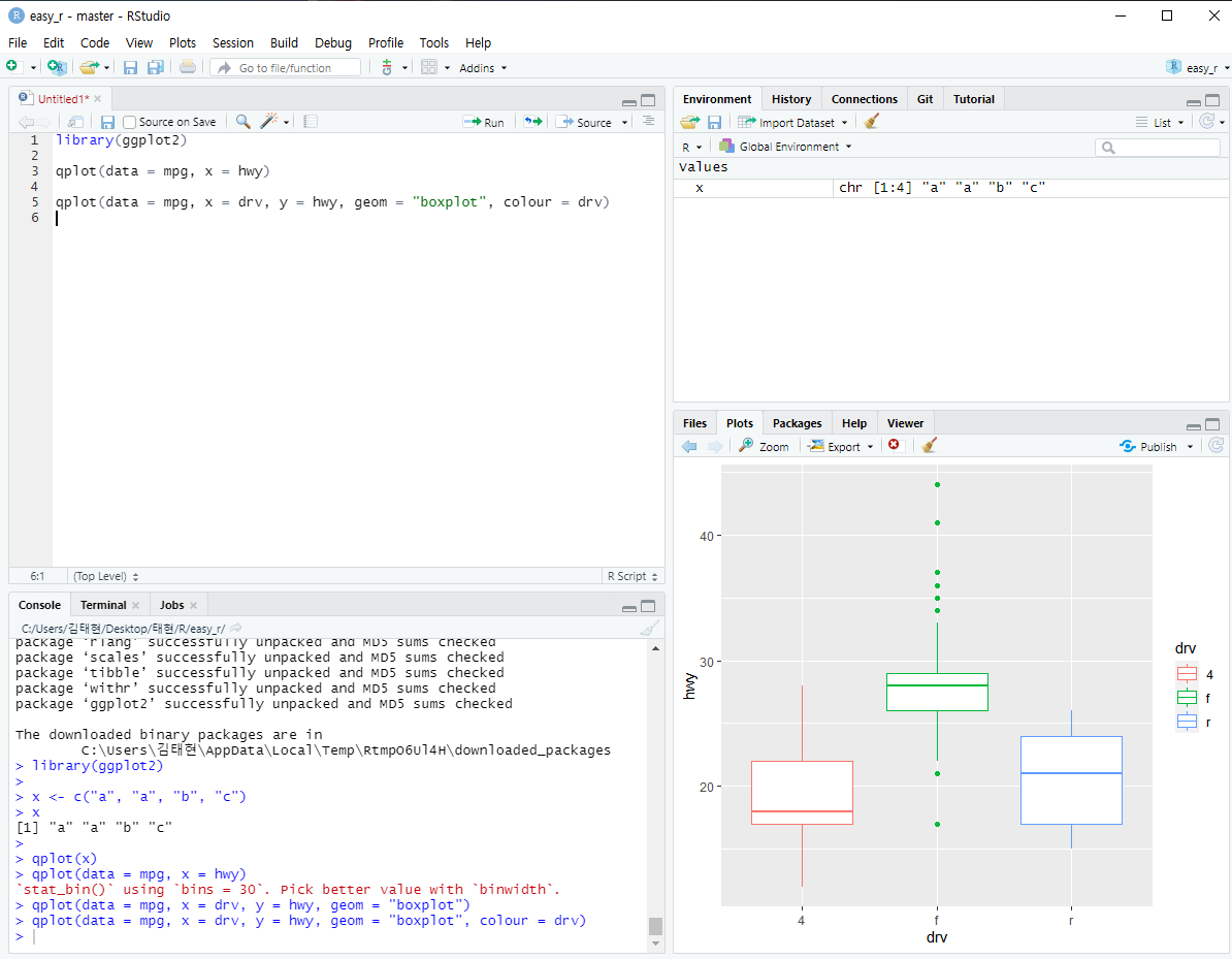 진짜 신기한건 script 창에다 install.package("ggplot2") 라고 치면 알아서 패키지를 다운받아온다.