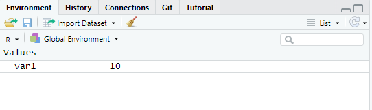 만약 var1 <- 10을 실행하지 않는다면 Environment 창에 var1이 생성되지 않는다.