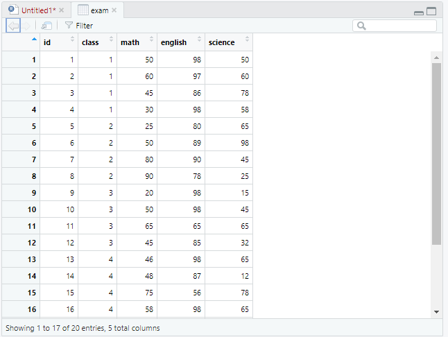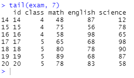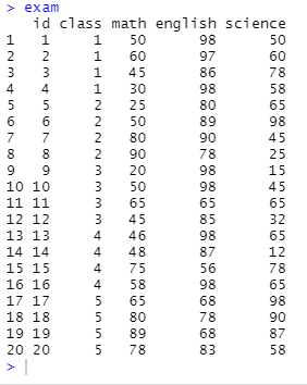 이로써 exam 데이터는 20행 5열로 이루어져 있음을 알 수 있다.