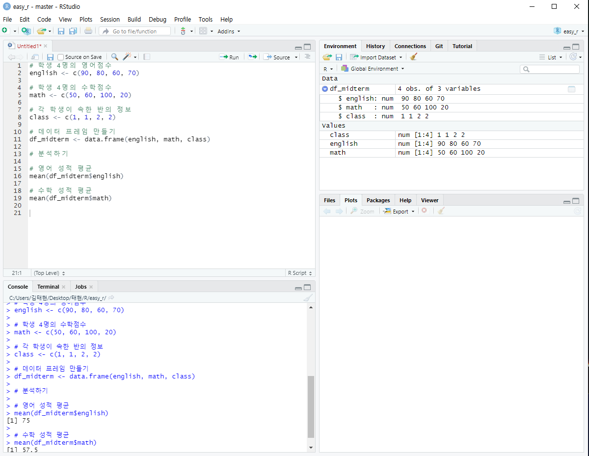 이제 R 스튜디오에서 직접 데이터 프레임을 만들어보자.