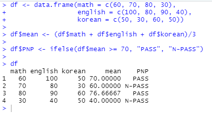 df$PNP <- ifelse(df$mean >= 70, "PASS", "N-PASS")