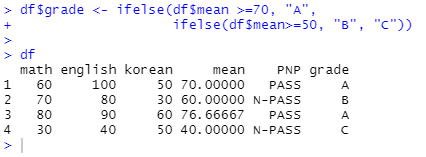 df$grade <- ifelse(df$mean >=70, "A",