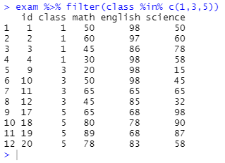 %in% 연산자는 매치 연산자라고 읽으며 변수의 값이 지정한 조건 목록에 해당하는지 확인한다.