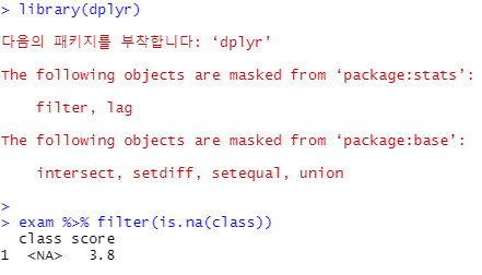 앞의 코드들에서는 !is.na(score) 같이 각 변수들을 찾아서 해당하는 행을 제거했다.