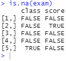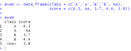 이때 5번째 학생의 클래스가 <NA>이고, 2번째 학생의 학점이 NA 이다.