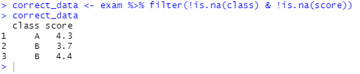 correct_data <- exam %>% filter(!is.na(class) & !is.na(score))