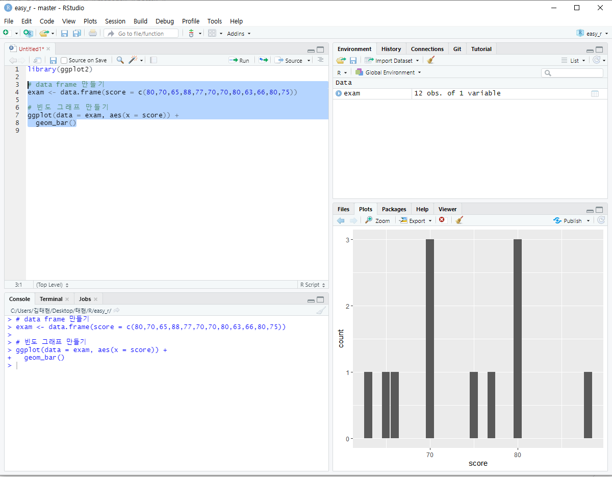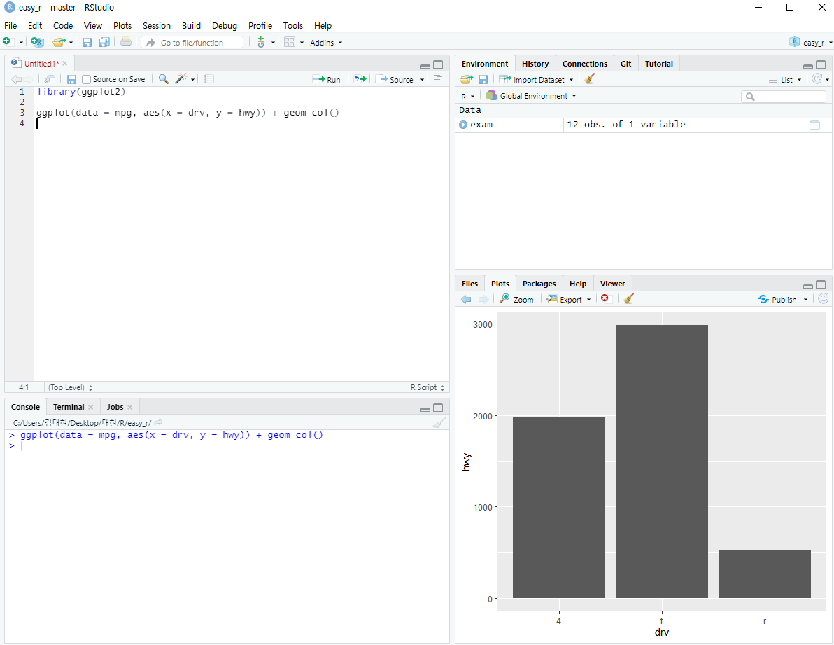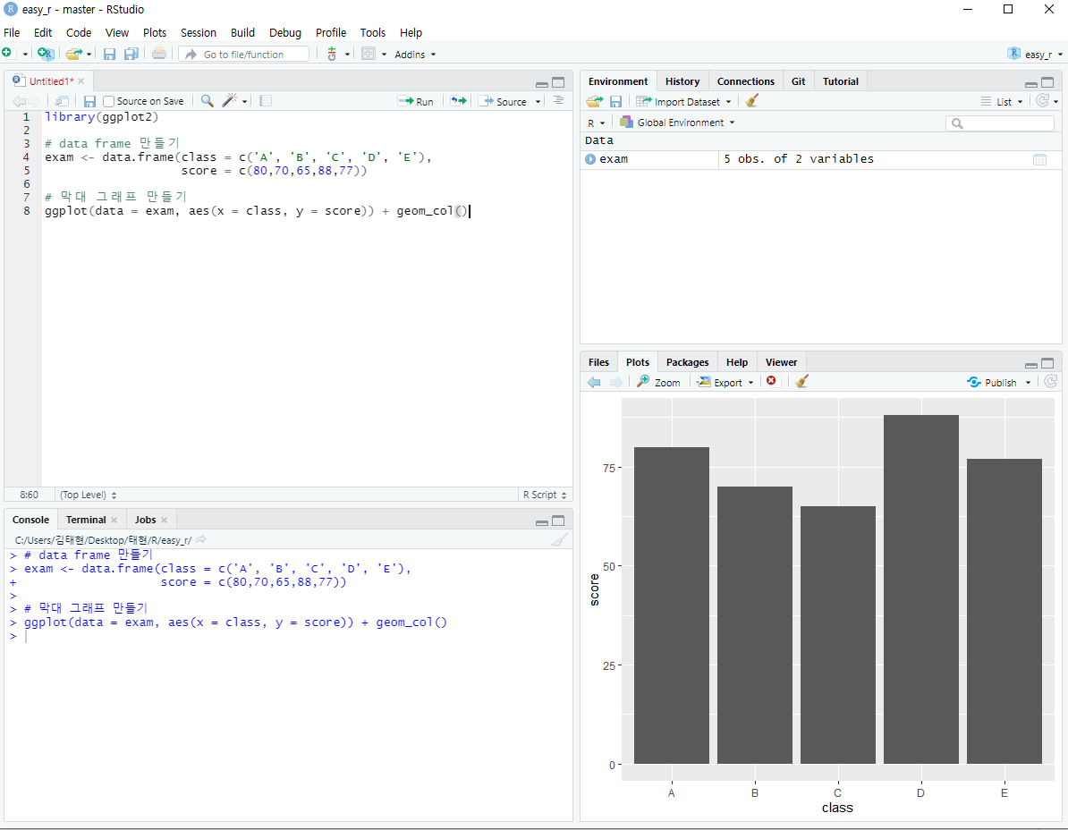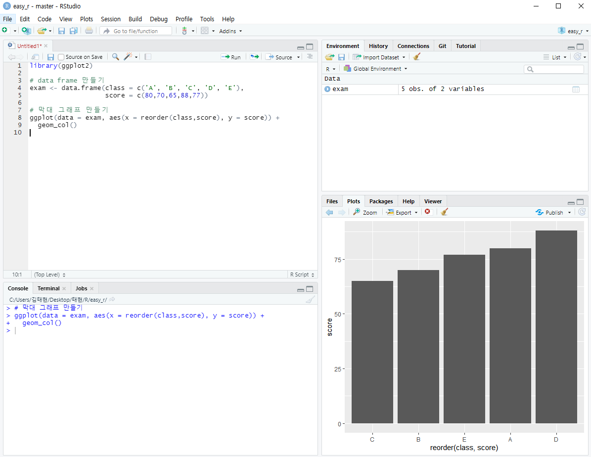 내가 직접 exam이란 data frame을 만들었고, 막대그래프를 그렸다.