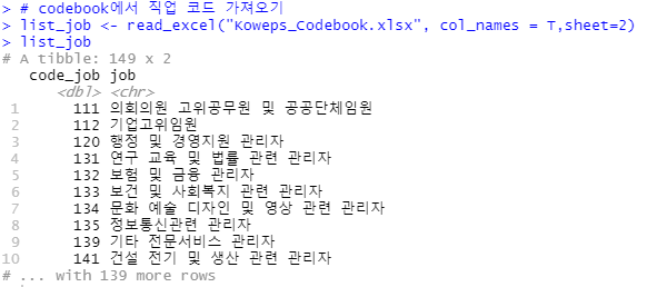 list_job <- read_excel("Koweps_Codebook.xlsx", col_names = T,sheet=2)