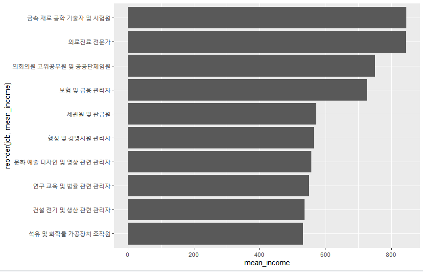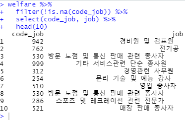 filter(!is.na(job) & !is.na(income)) %>% # job, income 결측치 제거