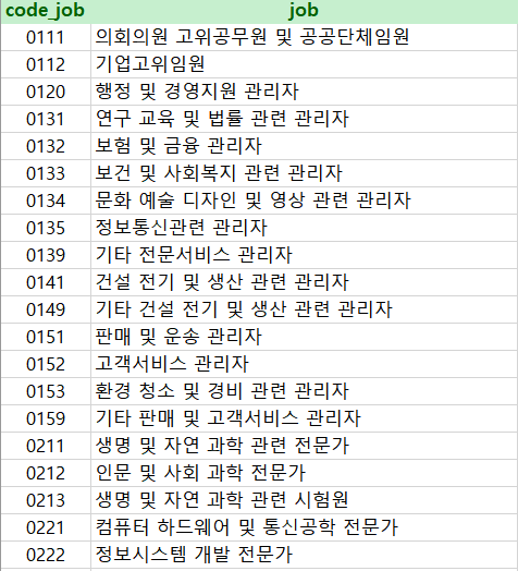 데이터엔 직업이 code_job 이란 변수에 담겨있다.
