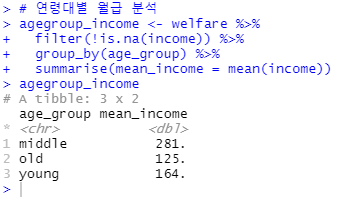 summarise(mean_income = mean(income)) # 평균 월급 구하기