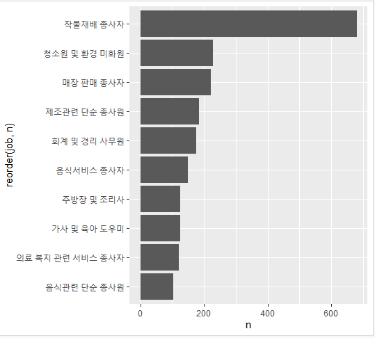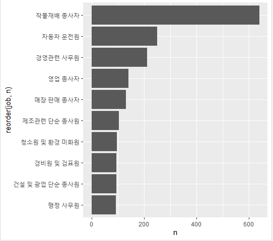 즉 각 직업별로 group_by를 통해 묶어놨으므로 요약은 각 그룹당 몇 명인지로 요약하겠다는 코드이다.