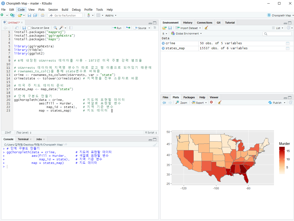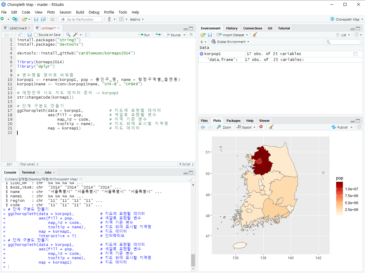 지역별 통계치를 색깔의 차이로 표현한 지도를 '단계 구분도'라고 하는데 오늘은 이걸 만들어 볼 예정이다.