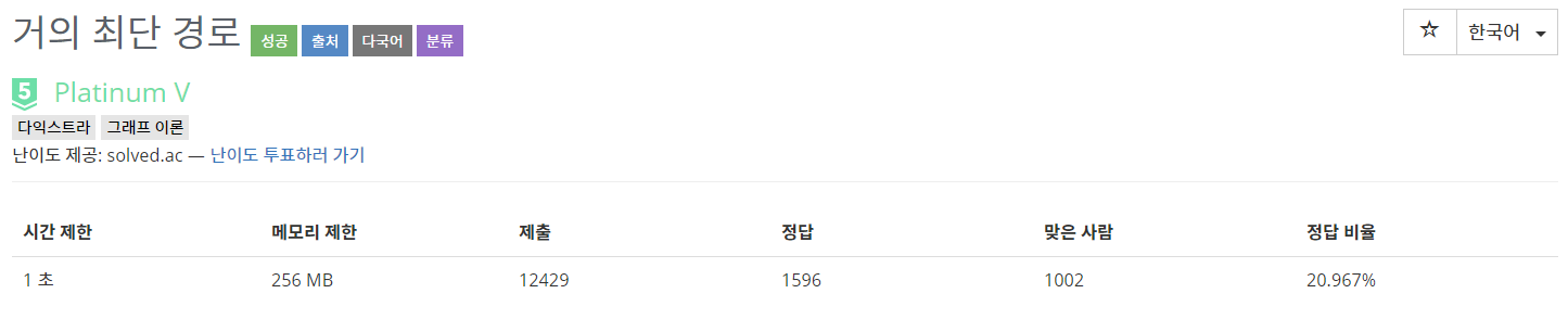플래티넘 문제이기도 하고 다익스트라 알고리즘 자체가 어려워 빠르게 포기하고 구글링 해본 게 살짝 아쉽긴 하다..
