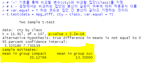t.test(data = mpg_diff, cty ~ class, var.equal = T)