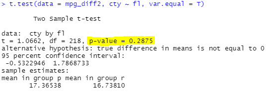 t.test(data = mpg_diff2, cty ~ fl, var.equal = T)
